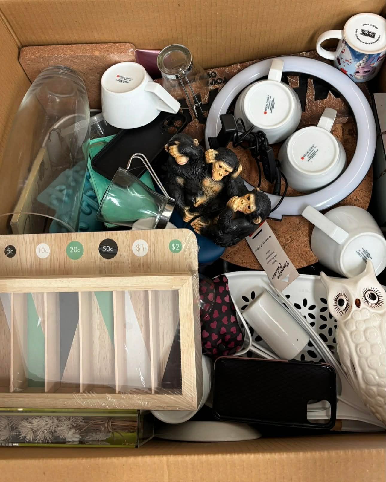Mixed secondhand household items collected from recycling bins. Includes homewares and miscellaneous goods like kitchen items, décor, accessories, and general merchandise.
